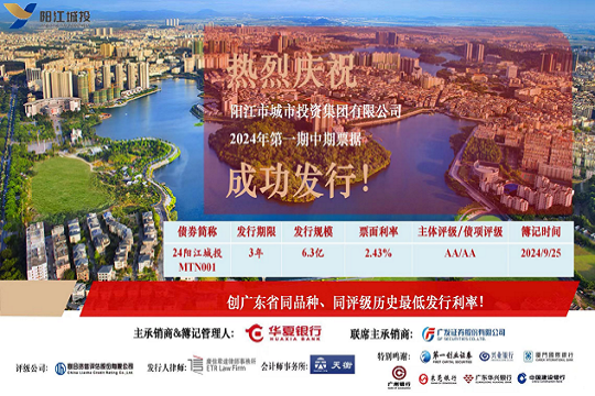 2024年9月26日,市城投集團(tuán)在中國銀行間交易商協(xié)會成功發(fā)行“陽江市城市投資集團(tuán)有限公司2024年第一期中期票據(jù)”。本期債券發(fā)行規(guī)模為6.3億元,期限為3年,票面利率2.43%,全場倍數(shù)超過2.52倍。本期債券創(chuàng)下了廣東省同...